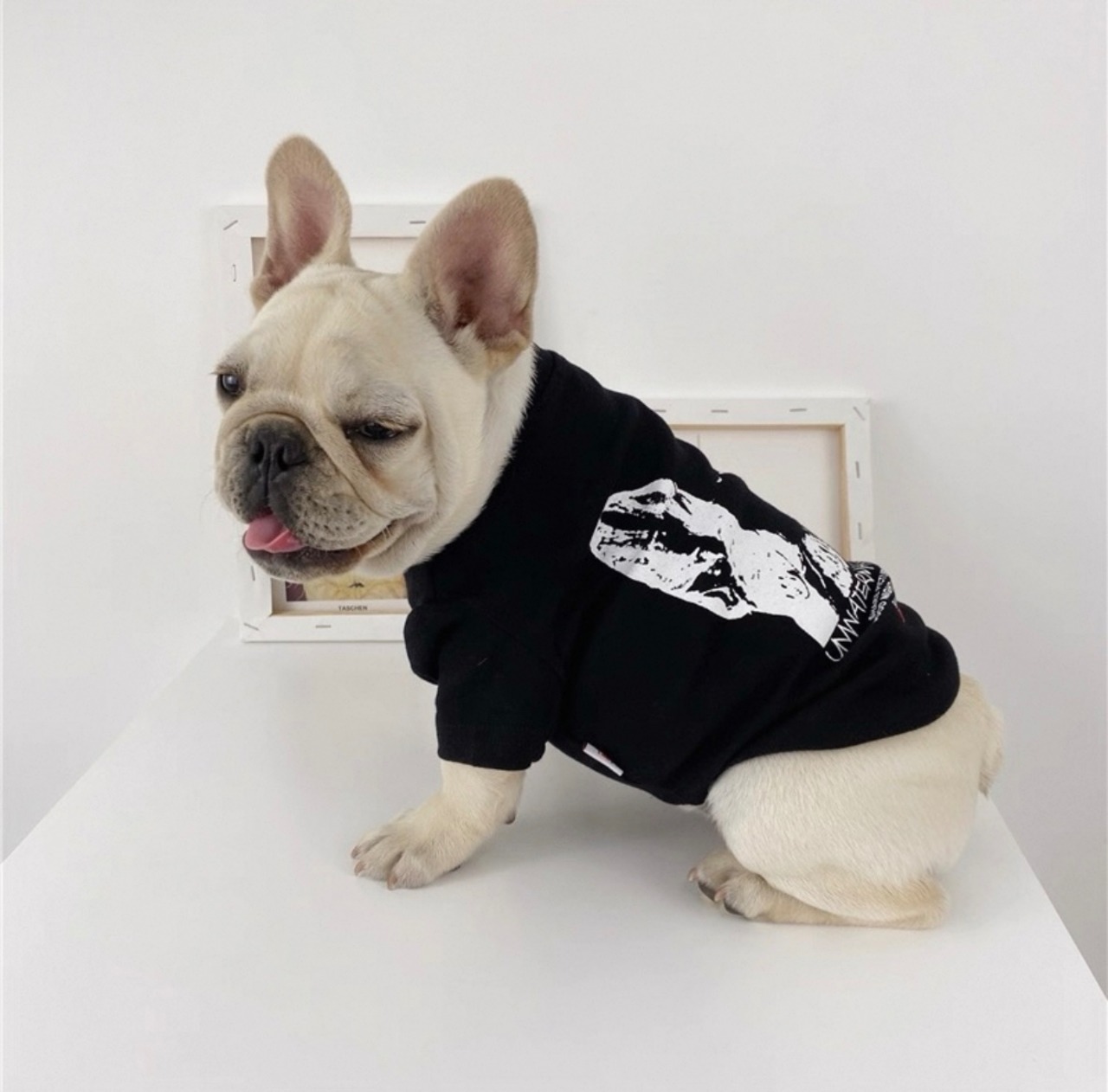 大胆に描かれたドッグフェイスは、フレンチブル ドッグにもボストンテリアにも見えるユニークな デザイン。