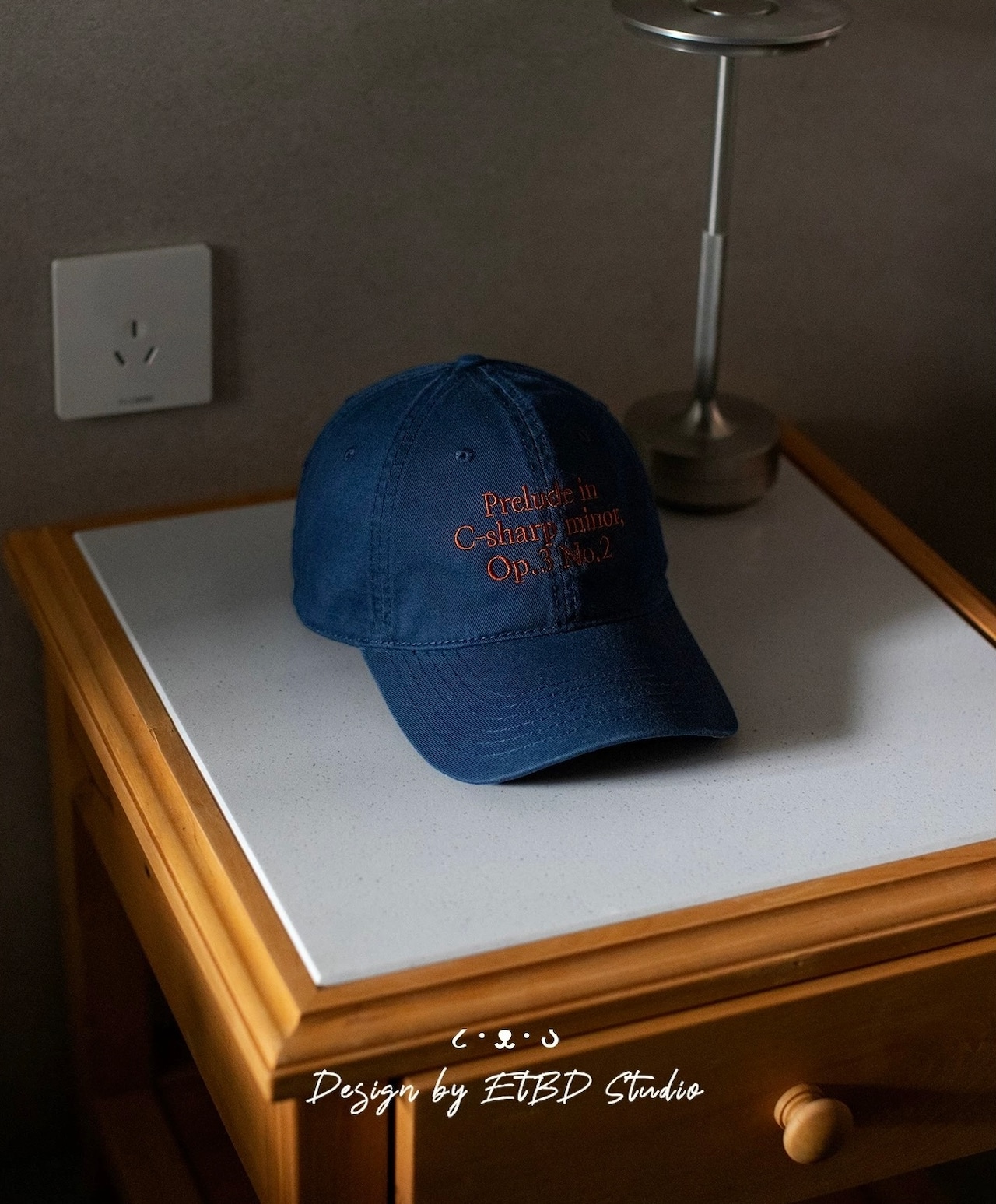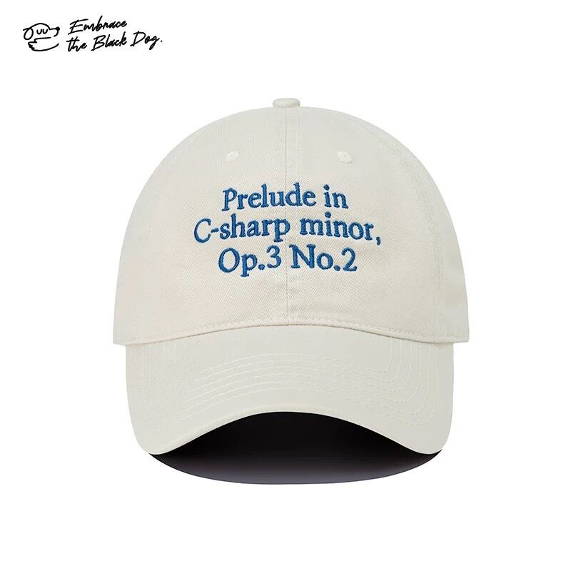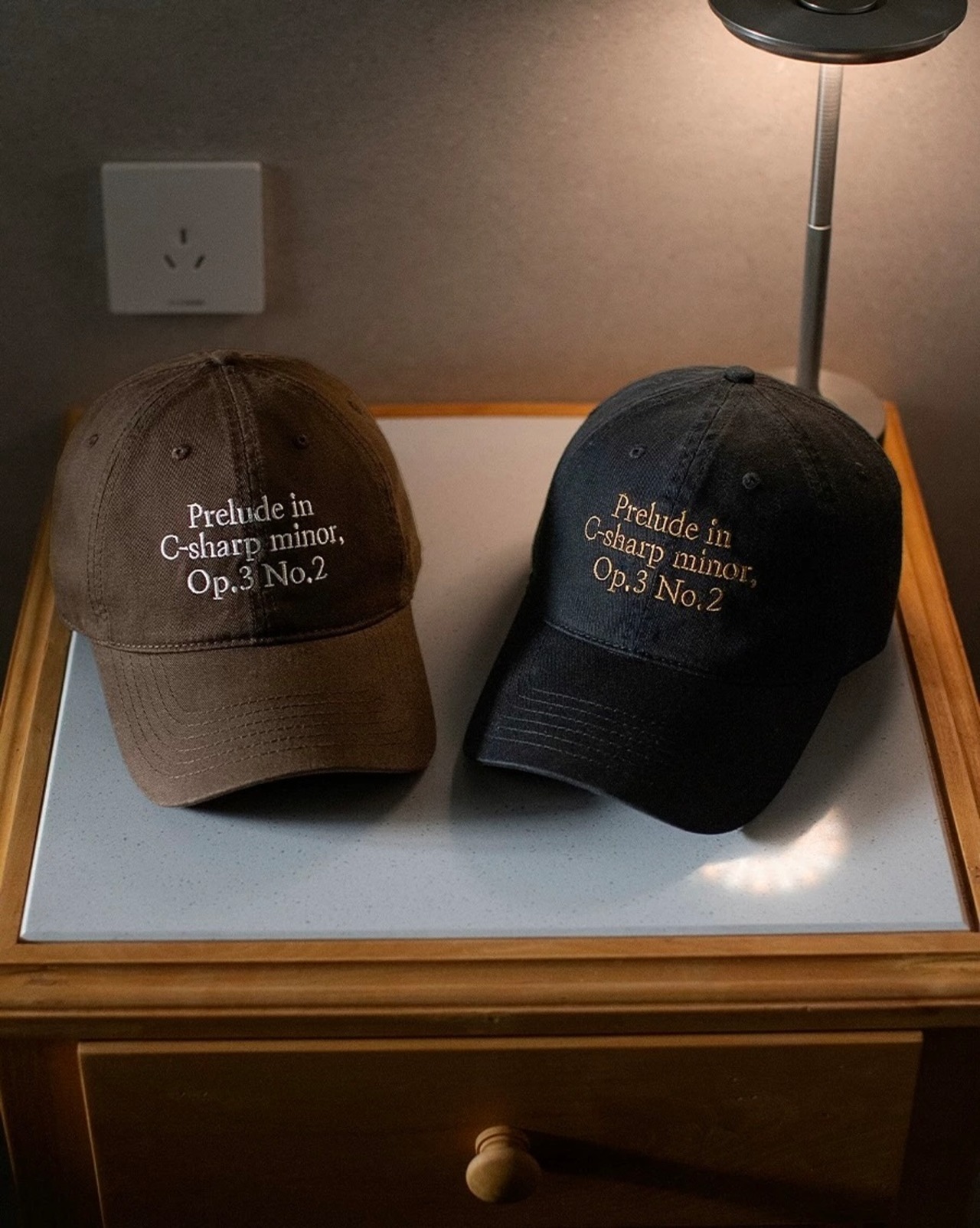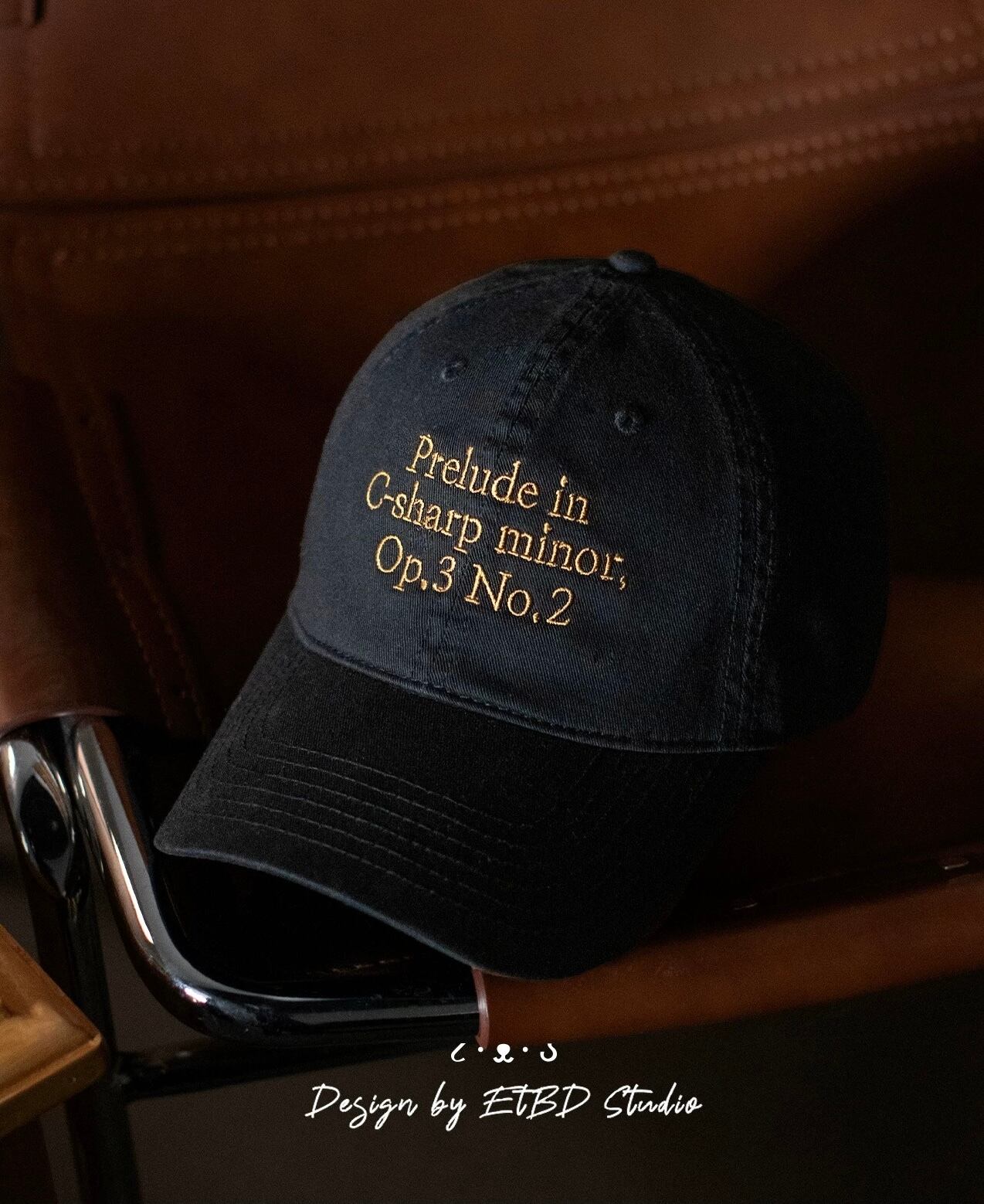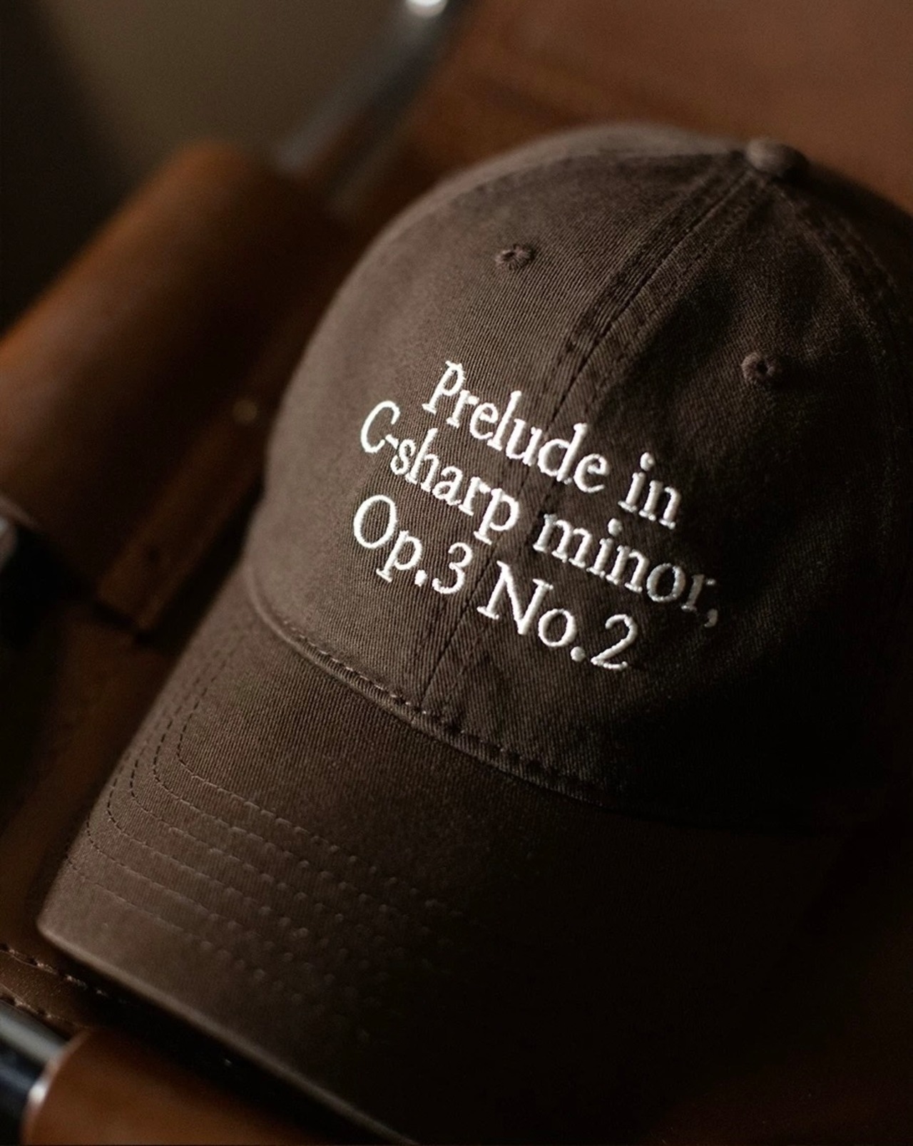 ラフマニノフ《嬰ハ短調の前奏曲 作品3の2》の一 節を刺繍したデザインキャップ。静かな存在感を放つこのフレーズがノンプルなフォルムに知的でアートな印象を添え ます。