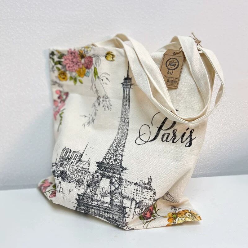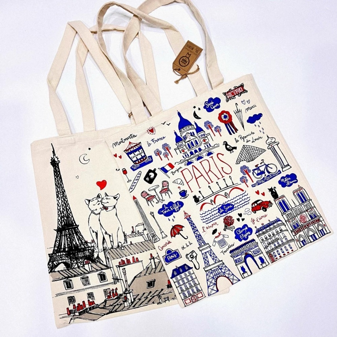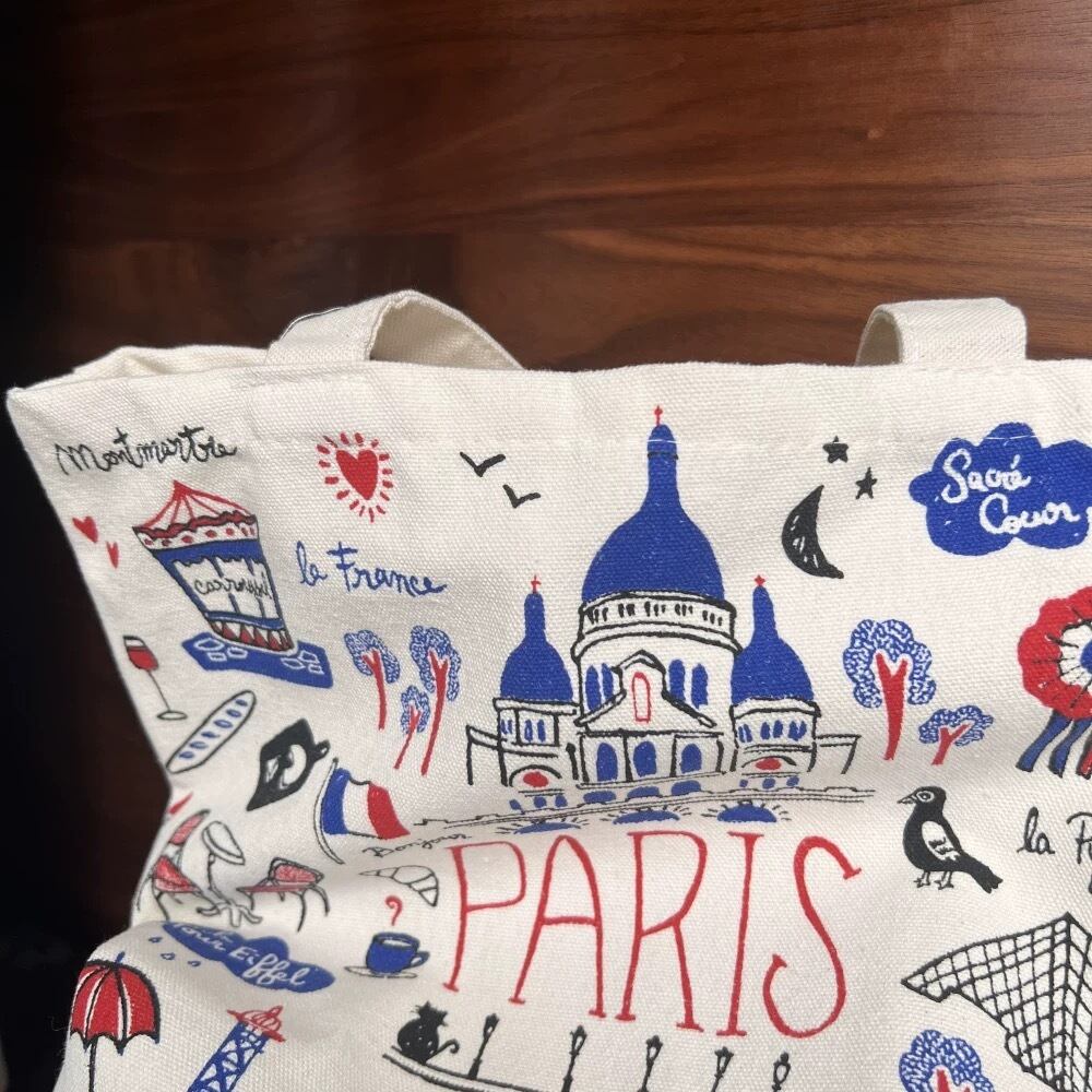 生成りのキャンパス地に、 パリの街並みやエッフェル塔、カフェなどをやさしいイラストタッチで描いたナチュラルトートです。