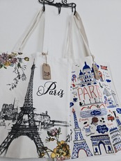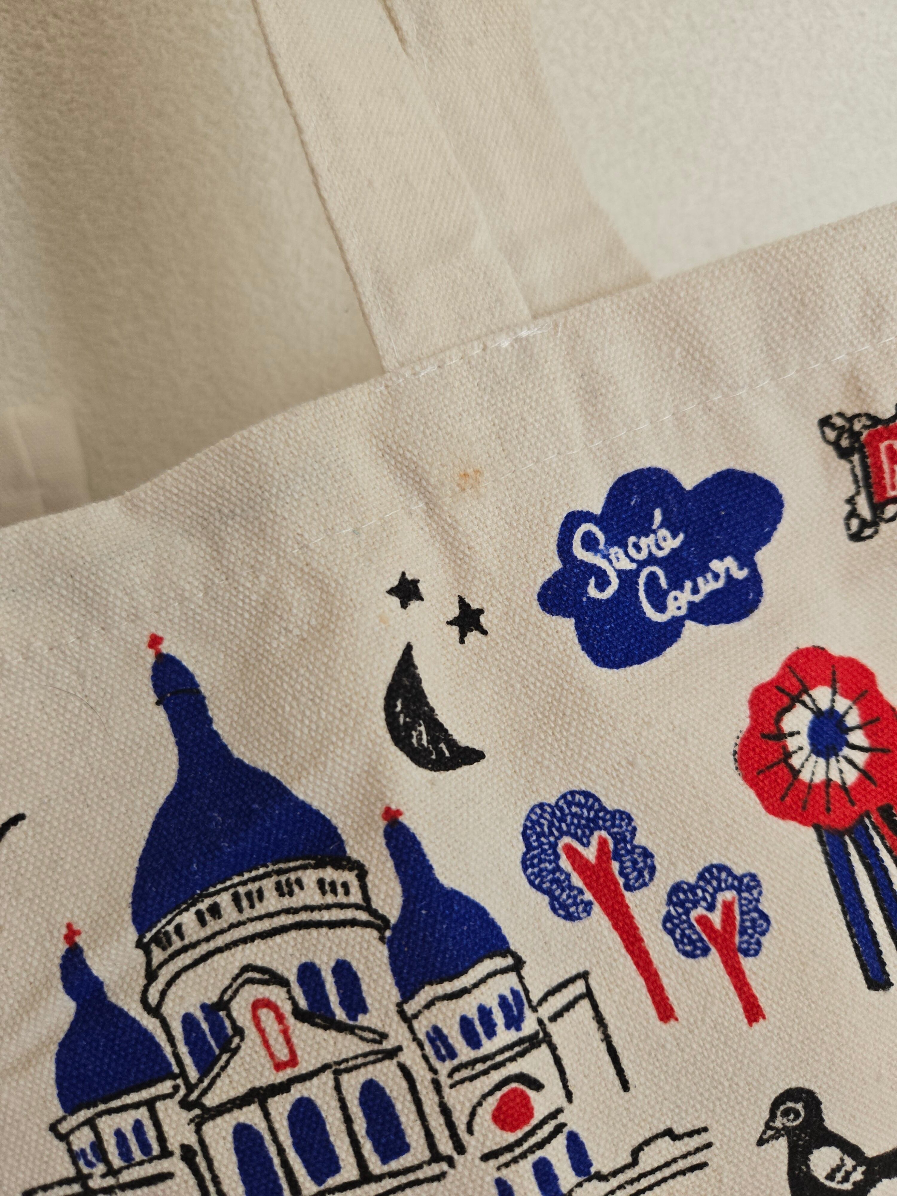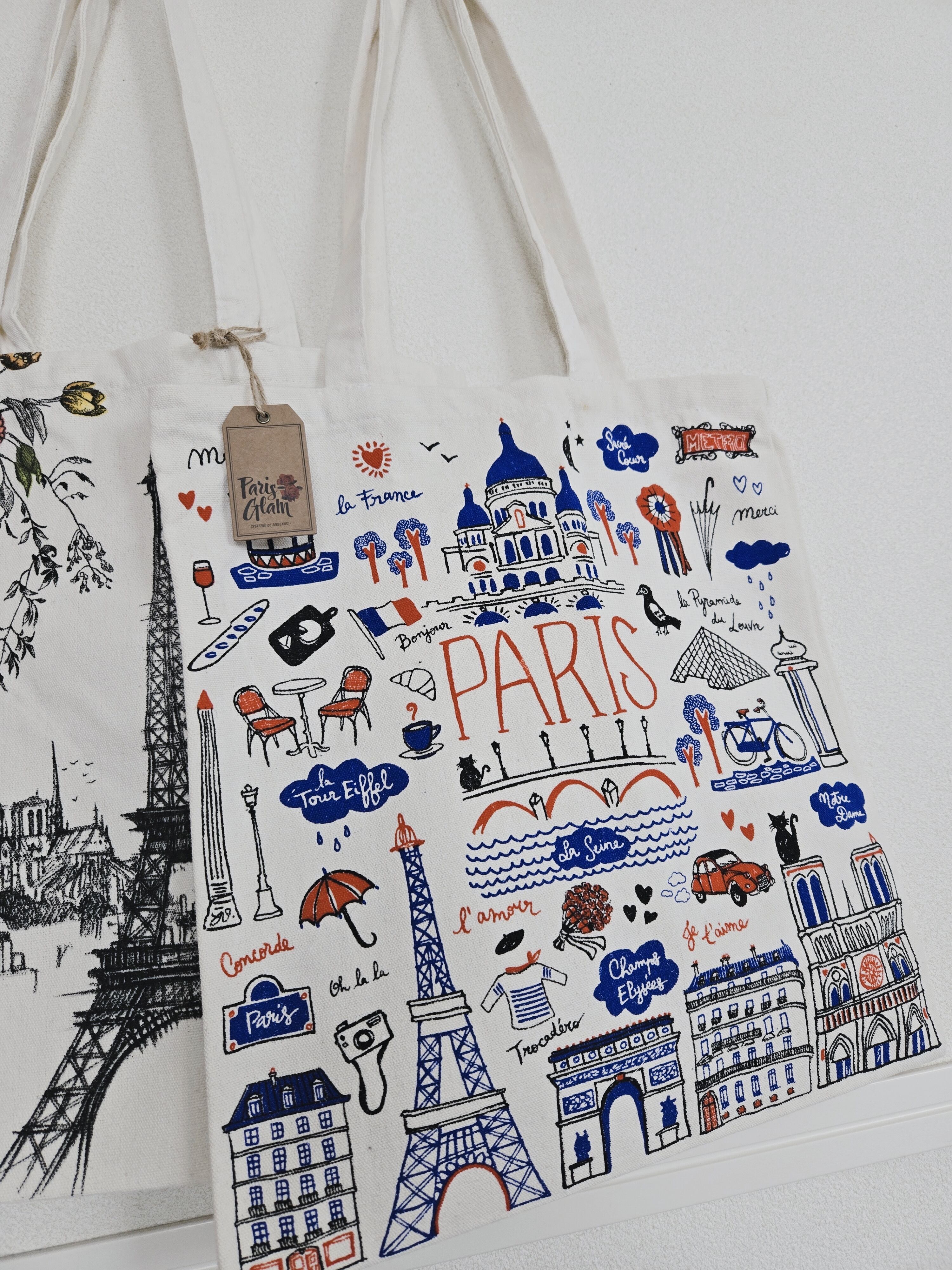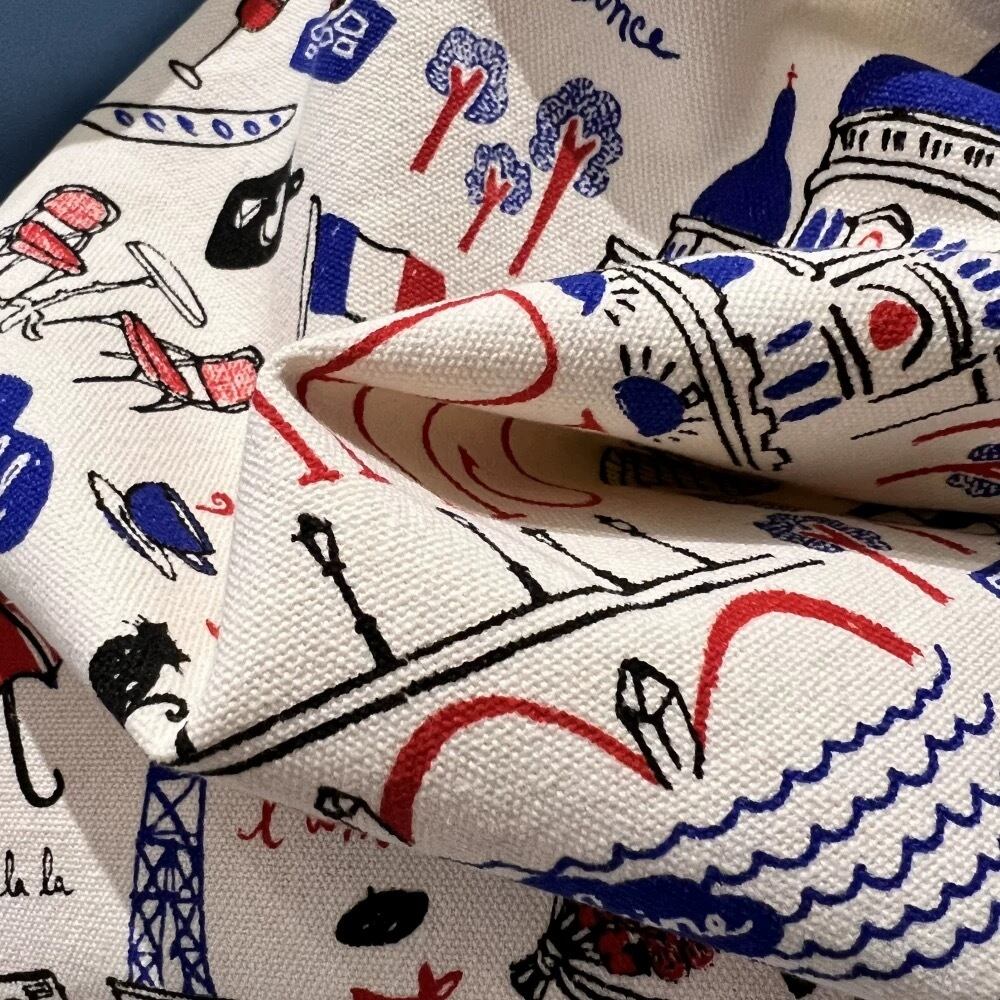 生成りのキャンパス地に、 パリの街並みやエッフェル塔、カフェなどをやさしいイラストタッチで描いたナチュラルトートです。